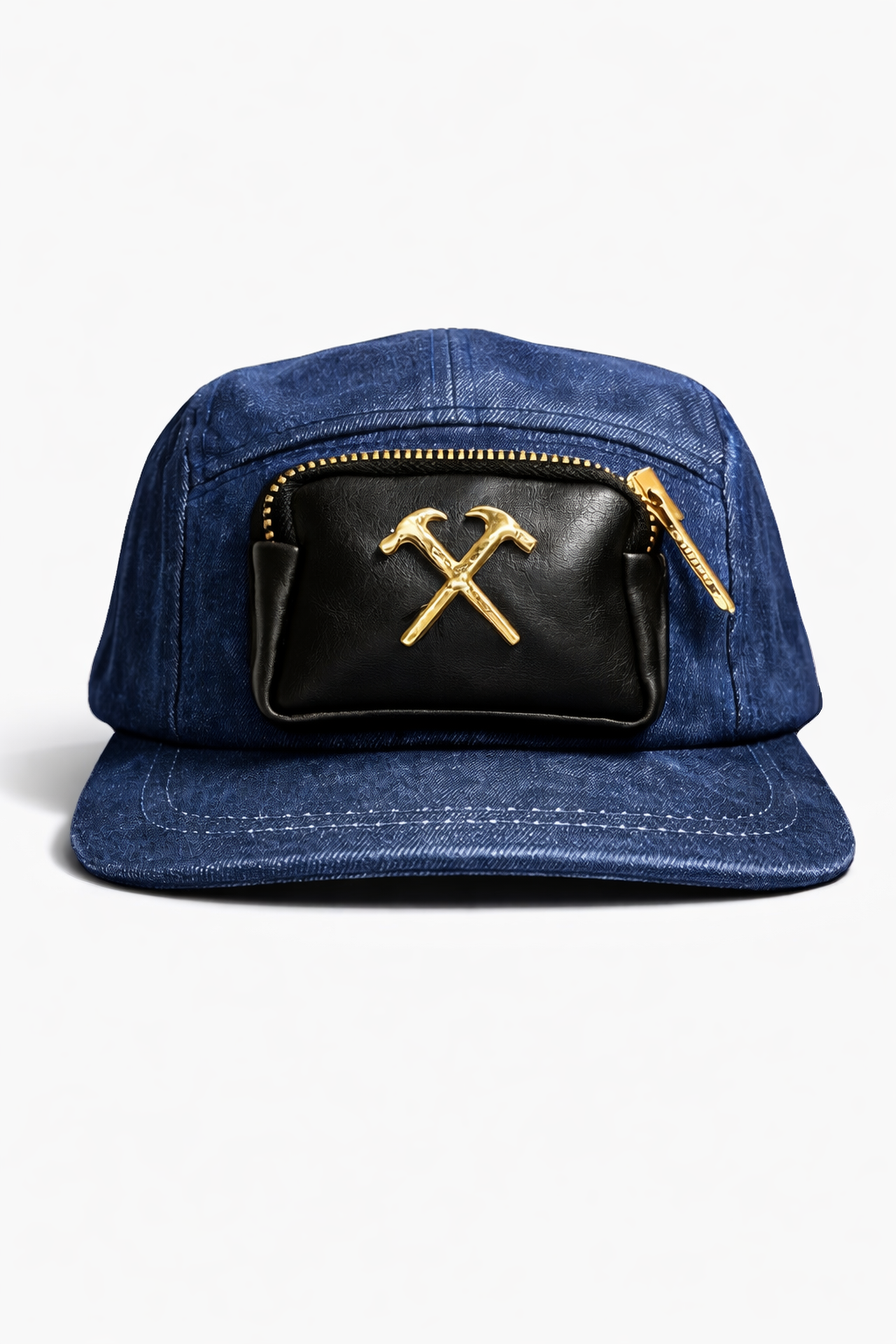 “Nina” Double Hammer Utility Cap redefines headwear through structured denim construction and integrated leather hardware detailing.
